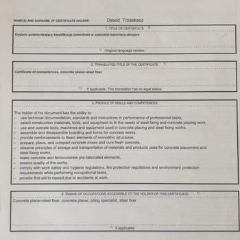 Im David. I have many years of experience in construction work supported by a 2-year construction school. I have a certificate and a diploma confirming my qualifications. Construction work is my passion and hobby. I also specialize in repairs, renovations, replacement of windows, doors, floors. builds garages from metal and wooden structures. I am polite, punctual and precise, I will undertake any work and guarantee competitive prices for goods. Certificate of competences, concrete placer-steel fixer If applicable. 3. PROFILE OF SKILLS AND COMPETENCES The holder of his document has the ability to: use technical documentation, standards and instructions in performance of professional tasks, select construction materials, tools, and equipment to fir the needs of steel fixing and concrete placing work, use and operate tools, machines and equipment used in concrete placing and steel fixing works, assemble and disassemble boarding and forms for concrete works, observe principles of storage and transportation of materials and products used for concrete placement and provide reinforcements to Basic elements of monolithic structures, prepare, place, and compact concrete mixes and cure fresh concrete, steel fixing works, make concrete and ferroconcrete pre-fabricated elements, assess quality of the works, comply with work safety and hygiene regulations, fire protection regulations and environment protection requirements while performing occupational tasks, provide first aid to injured due to accidents at work. 4. RANGE OF OCCUPATIONS ACCESSIBLE TO THE HOLDER OF THIS CERTIFICATE 1) Concrete placer-steel fixer, concrete placer, piling specialist, steel fixer