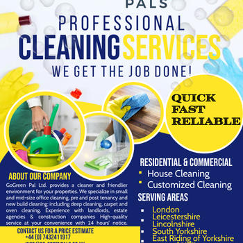 GoGreen Pal Ltd provides a cleaner and friendlier environment for your residential and commercial Properties. All types of property cleaning undertaken - whether domestic or commercial cleaning. We provide high-quality cleaning at a time convenient to you. We usually require 24 hours notice.  For domestic cleans, this includes: 1) Deep cleaning including the oven, fridge, and freezer cleaning (if emptied) and interior window cleaning (glass pane and frames). 2) Carpet cleaning 3) Regular cleaning - such as vacuum cleaning, dusting, mopping, kitchen, showers, bathrooms and toilets, and skirting boards. 4) Housekeeping - cleaning dishes, bedmaking, stripping, and changing the bed sheets. 5) Oven cleaning 6) Independent living cleaning 7) Whole house cleaning or partial house cleaning 8) Occasion or after-party clean 9) Patios and driveways cleaning 10) Garage cleans For commercial customers,  we provide: 1) Cleaning for small and mid-size offices 2) After build/new build cleans 3) Pre and end-of-tenancy cleaning 4) Kitchen and toilet area cleaning 5) Landlord cleans 6) HMOs - such as communal areas like the stairwells 7) Factory and warehouse cleans 8) Pre/after-event cleaning 9) Venue cleaning 10) Shop cleaning 11) Office cleaning including desks Do you have any allergies, especially to chemicals? Let us know when booking the appointment, and we will take this into consideration when deciding what products to use. We also use eco-friendly, plant-based products if requested. Serving: Lincolnshire, South Yorkshire, the East Riding of Yorkshire, and parts of the Hull area.   Fully insured professionals, catering to all your needs by offering an affordable customised solution. We take good care of your premises and clean them as we would our own.  We are experienced in working with landlords, estate agencies, and construction companies. Should you have any questions, please feel free in getting in touch with us.